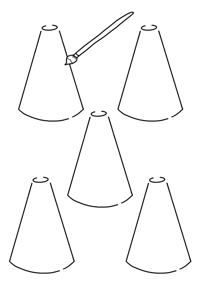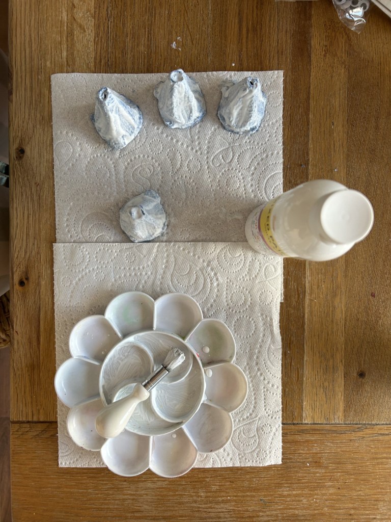 2. Put white paint on the paint palette. Lay out a sheet of tissue/ newspaper to place the triangle shapes on. Using the paintbrush, apply a layer of white paint to the triangles and let it dry. Apply as many layers as needed to cover the shape.