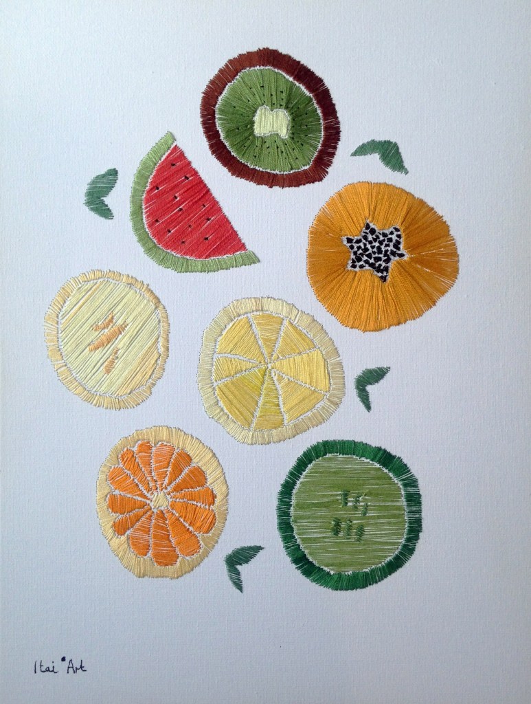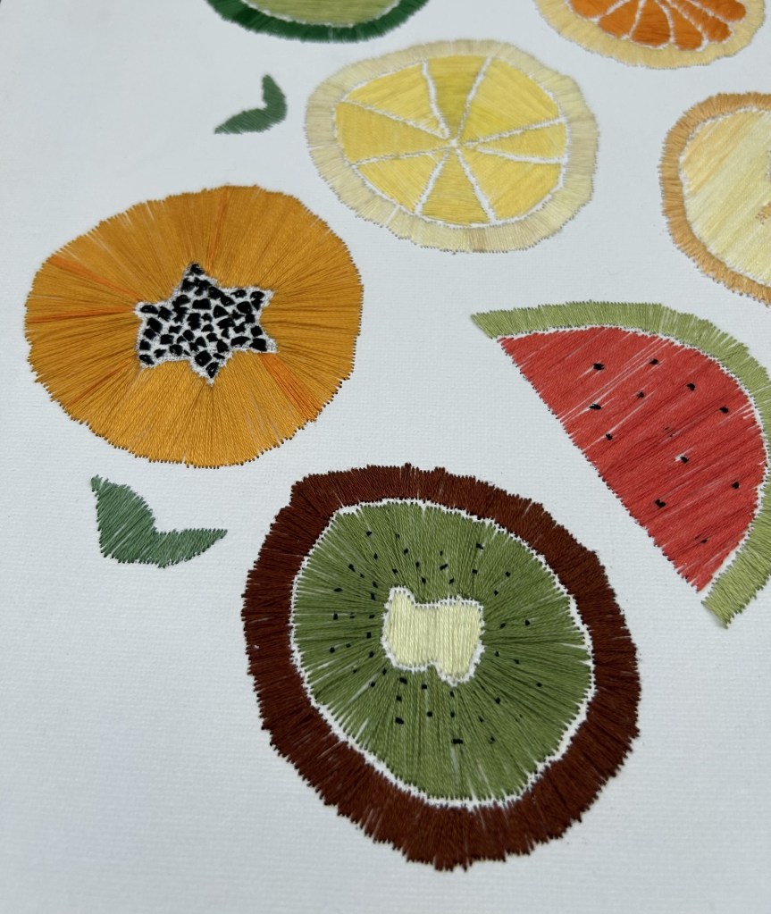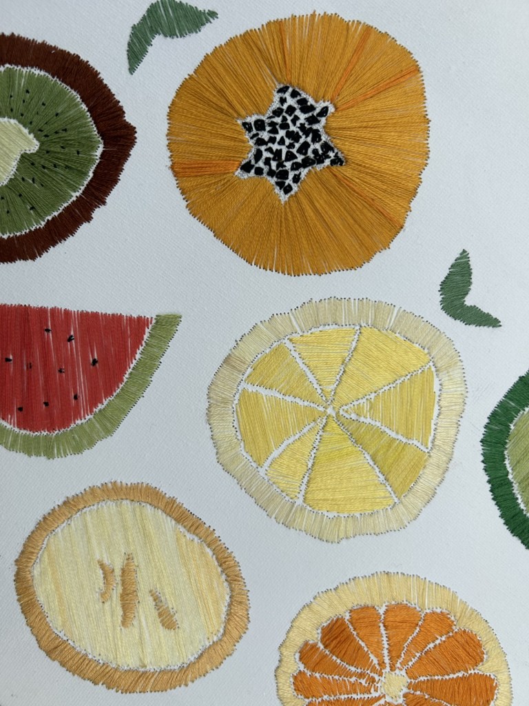 Stunning embroidery artwork on canvas, with intricate threads weaving together to create vibrant range of fruits. Inspired by Edel’s logo, the canvas is adorned with delicate, curved lines and textured stitches, capturing the fruit’s natural shape and colours. The result is truly one-of-a-kind piece of art that’s both whimsical and visually striking.